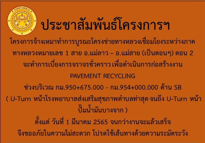 ประชาสัมพันธ์โครงการก่อสร้าง ทล.1 กม.950+675.000 - กม.954+000.000