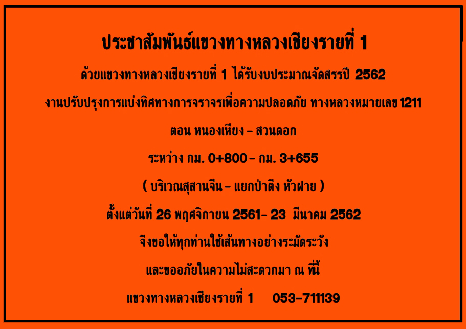 ด้วยแขวงทางหลวงเชียงรายที่ 1 ได้รับงบประมาณจัดสรรปี 2562 งานปรับปรุงการแบ่งทิศจราจรเพื่อความปลอดภัย บนทางหลวงหมายเลข 1211 ตอน หนองเหียง - สวนดอก ระหว่าง กม.0+800 - กม.3+655 (สุสานจีน - แยกป่าตึงหัวฝาย) ตั้งแต่วันที่ 26 พฤศจิกายน 2561 - 23 มีนาคม 2562