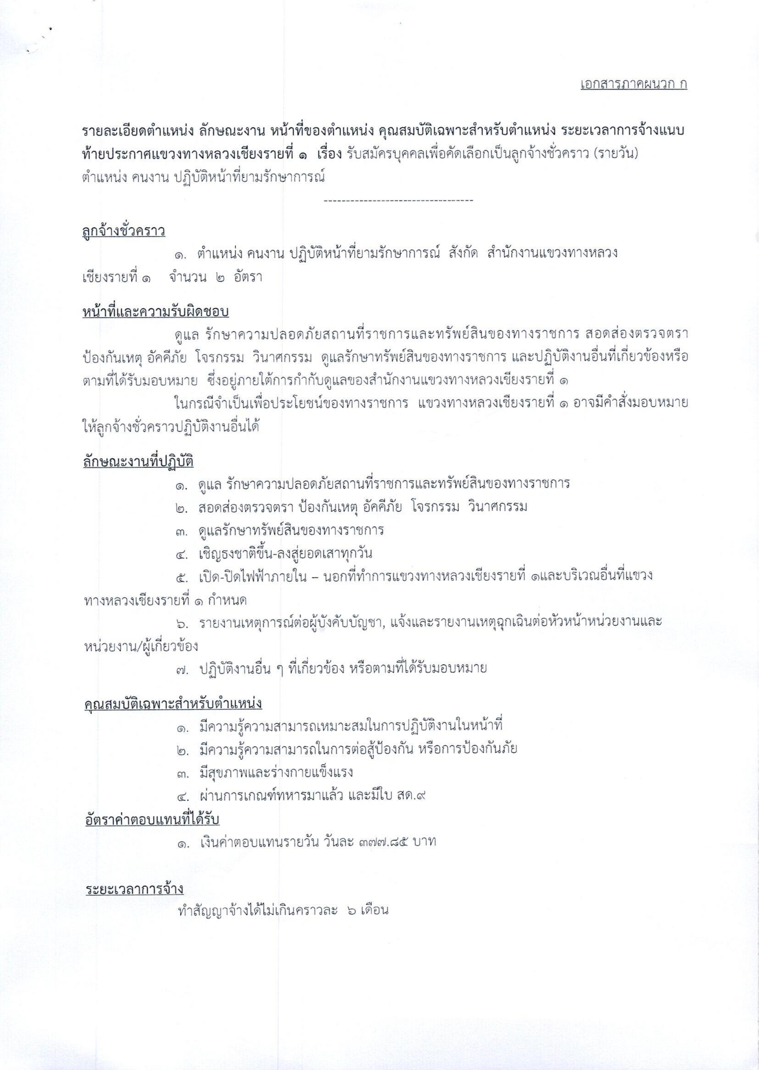 ประกาศแขวงทางหลวงเชียงรายที่ 1 เรื่องรับสมัครบุคคลเพื่อคัดเลือกเป็นลูกจ้างชั่วคราว (รายวัน) ตำแหน่งคนงาน ปฏิบัติหน้าที่ยามรักษาการณ์