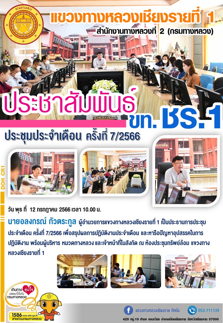 นายอลงกรณ์ กัวตระกูล ผู้อำนวยการแขวงทางหลวงเชียงรายที่ 1 เป็นประธานการประชุมประจำเดือน ครั้งที่ 7/2566 เพื่อสรุปผลการปฏิบัติงานประจำเดือน และหารือปัญหาอุปสรรคในการปฏิบัติงาน พร้อมผู้บริหาร หมวดทางหลวง และเจ้าหน้าที่ในสังกัด ณ ห้องประชุมทรัพย์ล้อม แขวงทางหลวงเชียงรายที่ 1