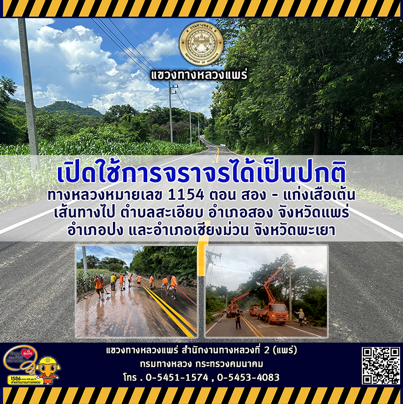 แจ้งข่าวประชาสัมพันธ์ แขวงทางหลวงแพร่ วันที่ 23 สิงหาคม 2567 ทางหลวงหมายเลข 1154 ตอน สอง - แก่งเสือเต้น เข้าสู่ภาวะปกติ สามารถเปิดใช้การจราจรได้เป็นปกติ