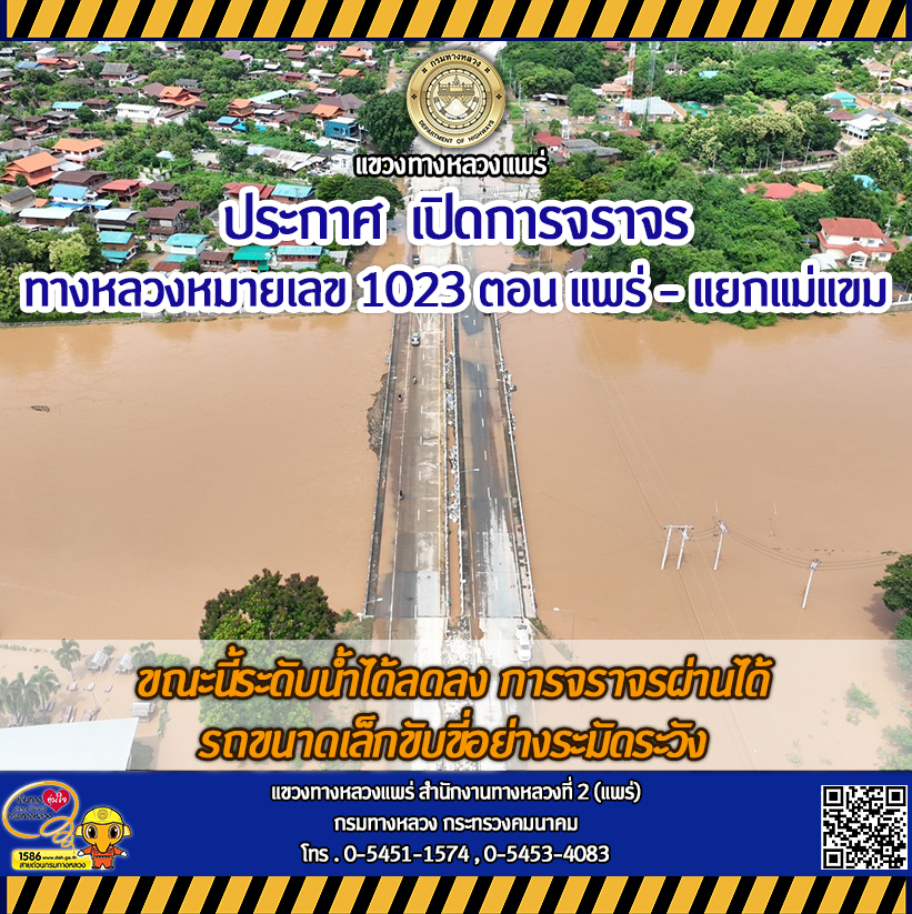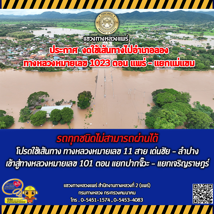 แจ้งข่าวประชาสัมพันธ์ วันที่ 23 สิงหาคม 2567 แขวงทางหลวงแพร่ ประกาศ งดใช้เส้นทางไปอำเภอลอง ทางหลวงหมายเลข 1023 ตอน แพร่ - แยกแม่แขม