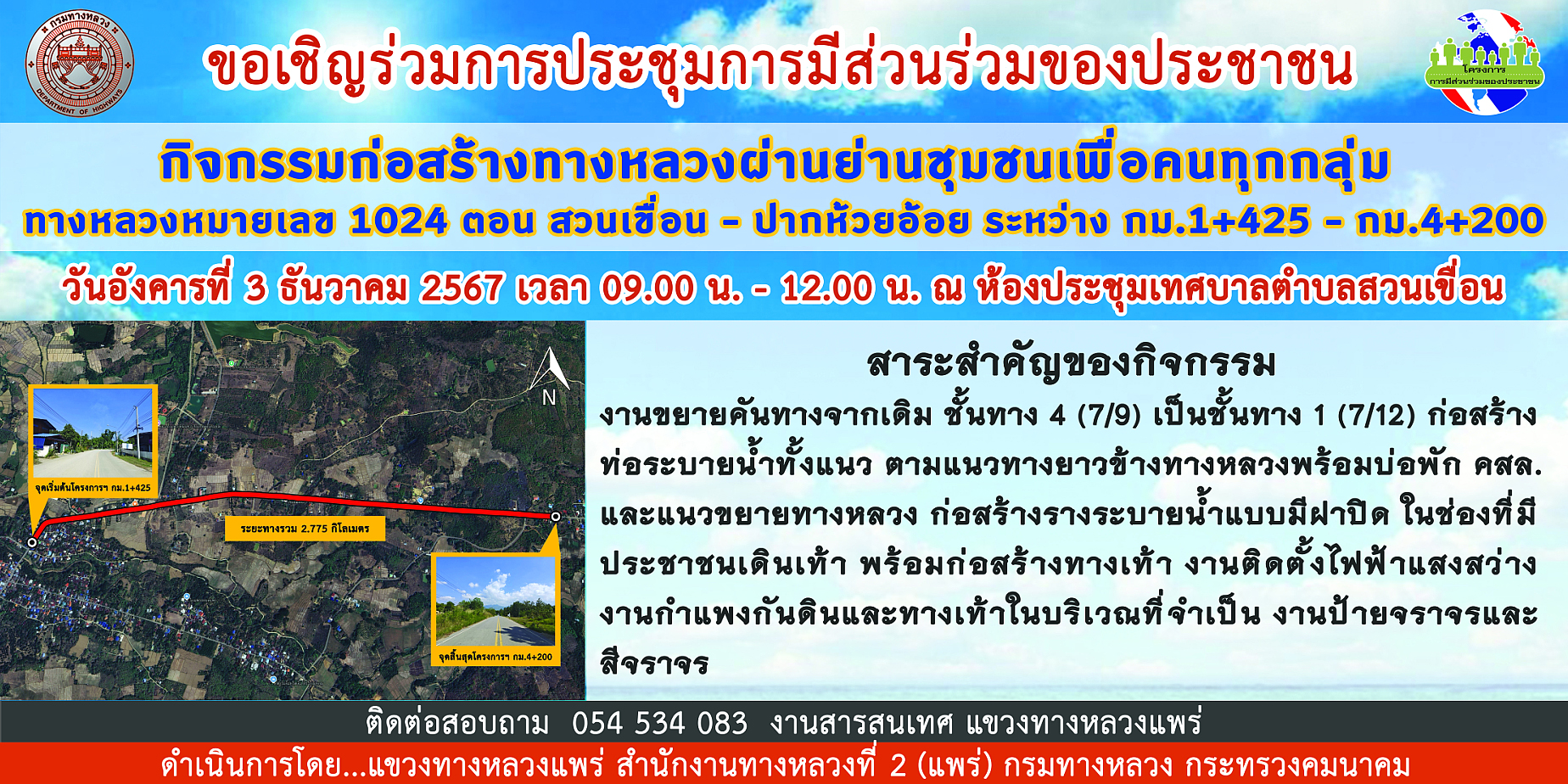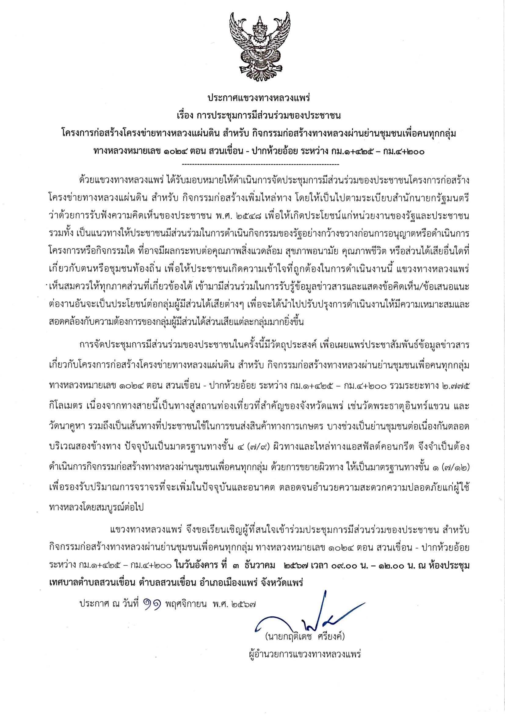 ประกาศแขวงทางหลวงแพร่ เรื่องการประชุมการมีส่วนร่วมของประชาชน โครงการก่อสร้างโครงข่ายทางหลวงแผ่นดิน สำหรับ กิจกรรมก่อสร้างทางหลวงผ่านย่านชุมชนเพื่อคนทุกกลุ่ม ทางหลวงหมายเลข ๑๐๒๔ ตอน สวนเขื่อน - ปากห้วยอ้อย ระหว่าง กม.๑+๔๒๕ – กม.๔+๒๐๐