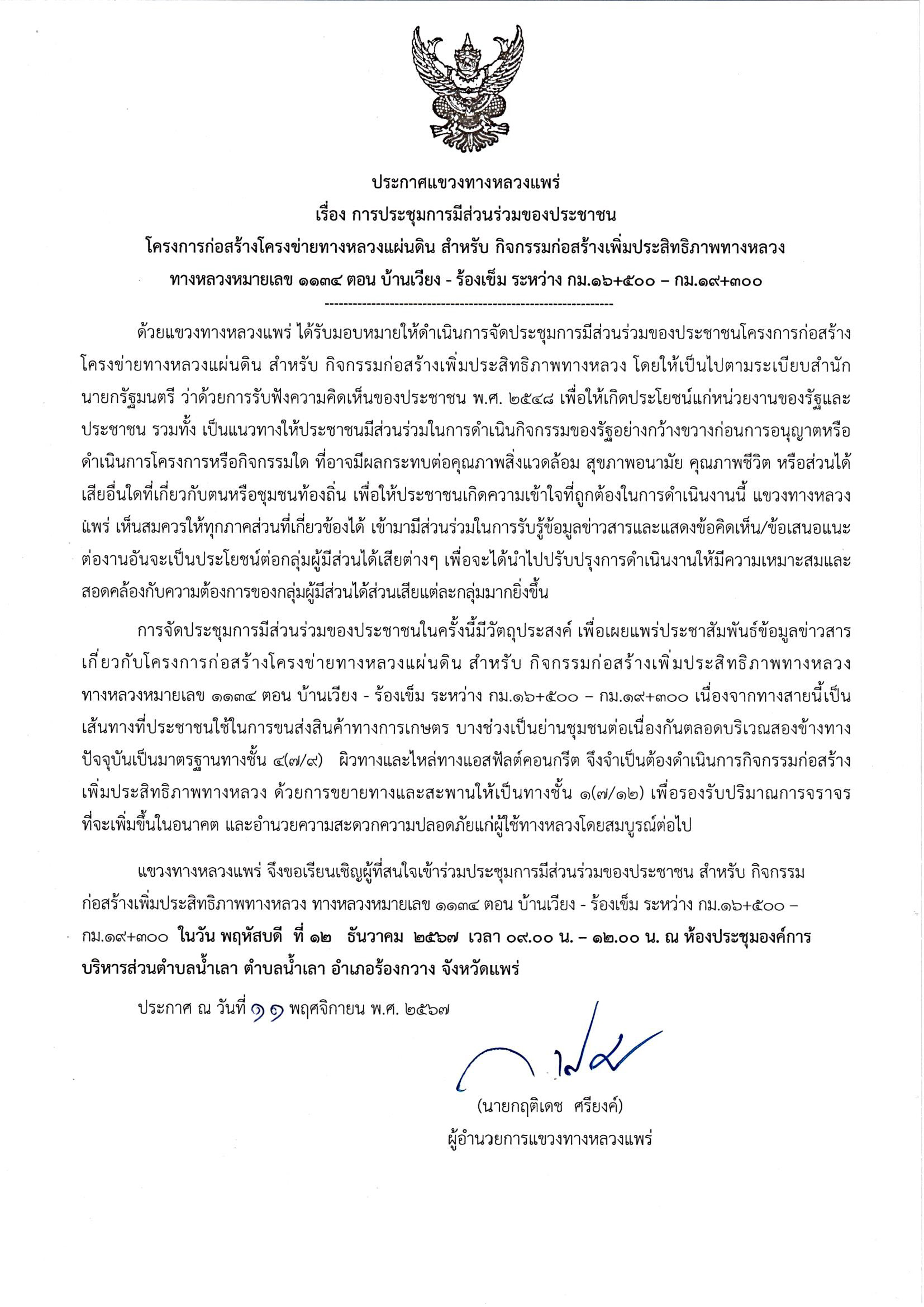 ประกาศแขวงทางหลวงแพร่ เรื่องการประชุมการมีส่วนร่วมของประชาชน โครงการก่อสร้างโครงข่ายทางหลวงแผ่นดิน สำหรับ กิจกรรมก่อสร้างเพิ่มประสิทธิภาพทางหลวง ทางหลวงหมายเลข ๑๑๓๔ ตอน บ้านเวียง - ร้องเข็ม ระหว่าง กม.๑๖+๕๐๐ – กม.๑๙+๓๐๐