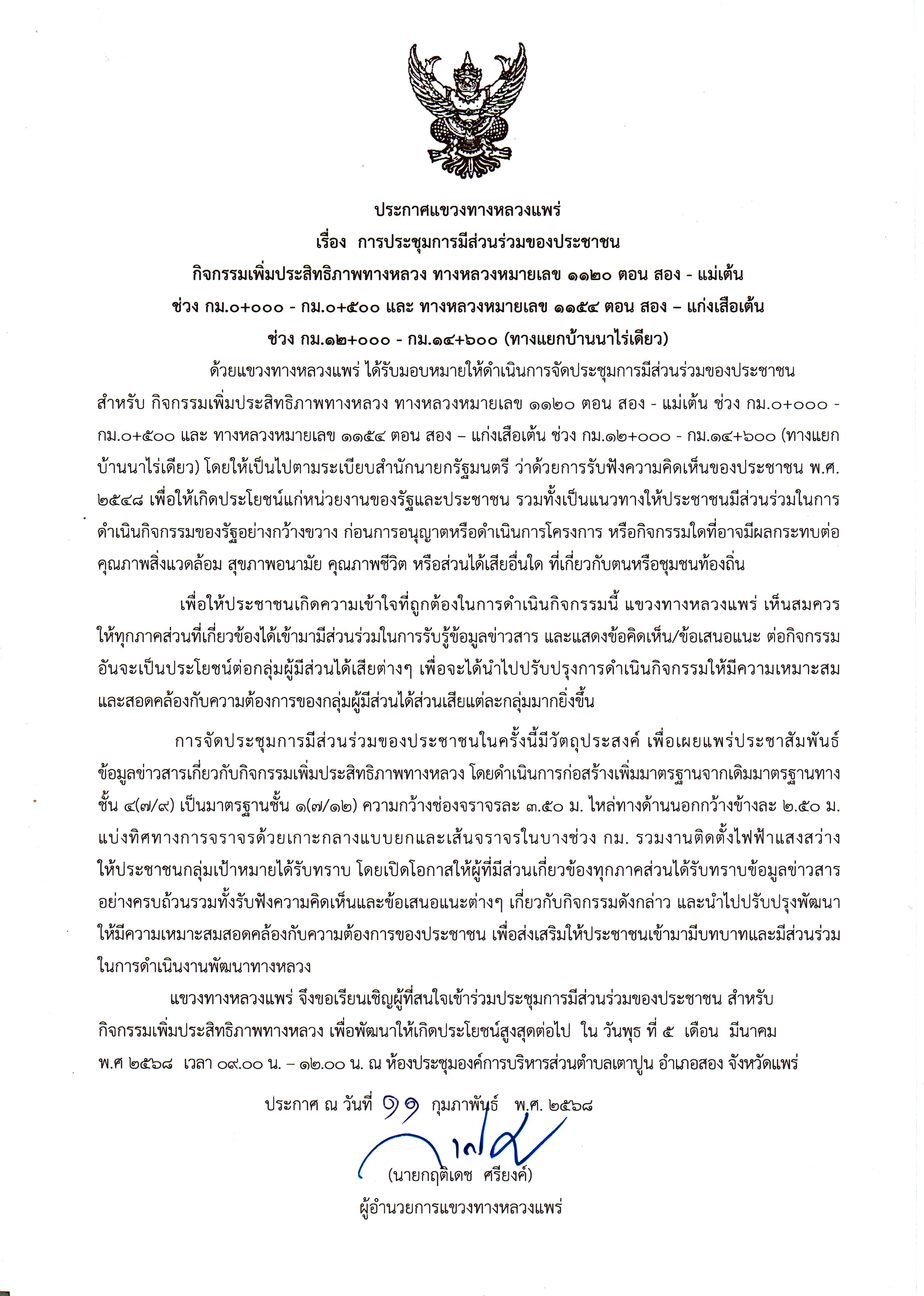 ประกาศแขวงทางหลวงแพร่ เรื่องการประชุมการมีส่วนร่วมของประชาชน โครงการก่อสร้างโครงข่ายทางหลวงแผ่นดิน สำหรับ กิจกรรมก่อสร้างเพิ่มประสิทธิภาพทางหลวง ทางหลวงหมายเลข ๑๑๒๐ ตอน สอง - แม่เต้น ช่วง กม.๐+๐๐๐ - กม.๐+๕๐๐ และทางหลวงหมายเลข ๑๑๕๔ ตอน สอง - แก่งเสือเต้น ช่วง กม.๑๒+๐๐๐ - กม.๑๔+๖๐๐ (ทางแยกบ้านนาไร่เดียว)