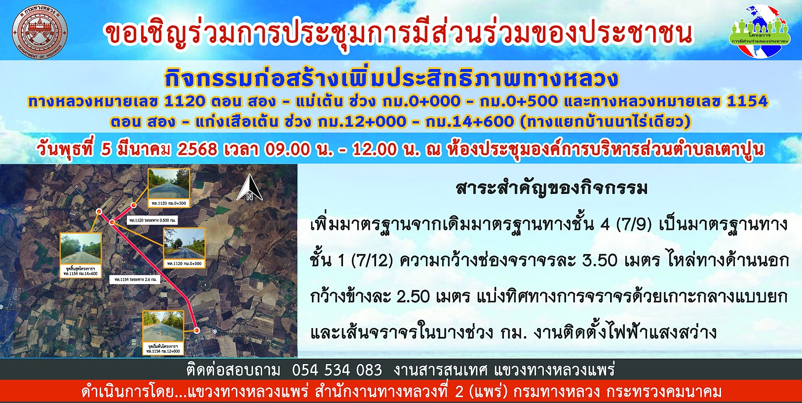 ประชาสัมพันธ์ การประชุมการมีส่วนร่วมของประชาชน ทล.๑๑๒๐ ตอน สอง - แม่เต้น ช่วง กม.๐+๐๐๐ - กม.๐+๕๐๐ และทางหลวงหมายเลข ๑๑๕๔ ตอน สอง - แก่งเสือเต้น ช่วง กม.๑๒+๐๐๐ - กม.๑๔+๖๐๐ (ทางแยกบ้านนาไร่เดียว)