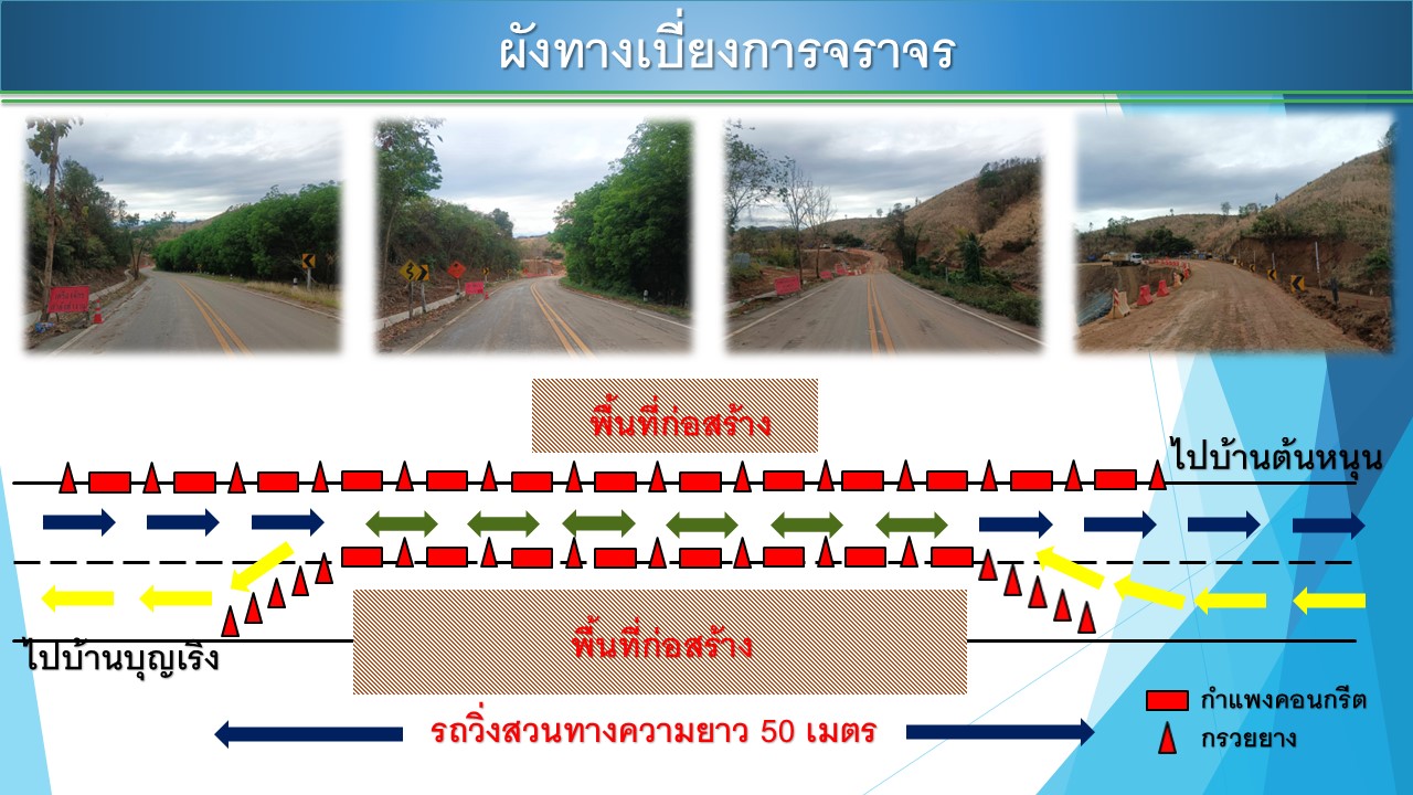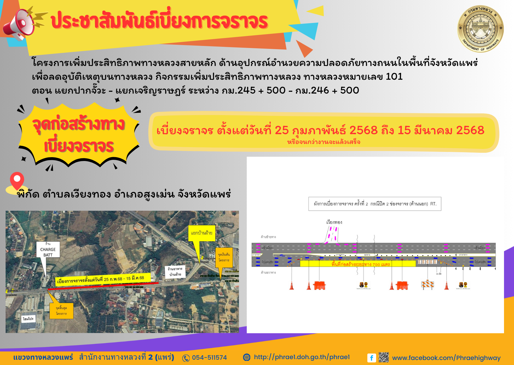 ประชาสัมพันธ์ ขออนุญาติเบี่ยงช่องทางการจราจร ตั้งแต่วันที่ 25 กุมภาพันธ์ 2568 - 15 มีนาคม 2568 หรือจนกว่างานจะแล้วเสร็จ ทางหลวงหมายเลข 101 ตอน แยกปากจั๊วะ - แยกเจริญราษฎร์ (หน้าบ้านเวียงทอง) กม.245+500 - กม.246+500