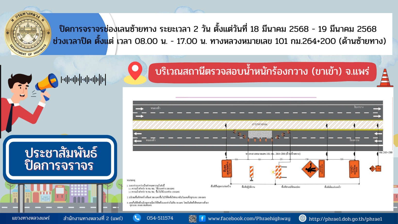 ประชาสัมพันธ์ ปิดการจราจร บริเวณสถานีตรวจสอบน้ำหนักร้องกวาง (ขาเข้า) จ.แพร่