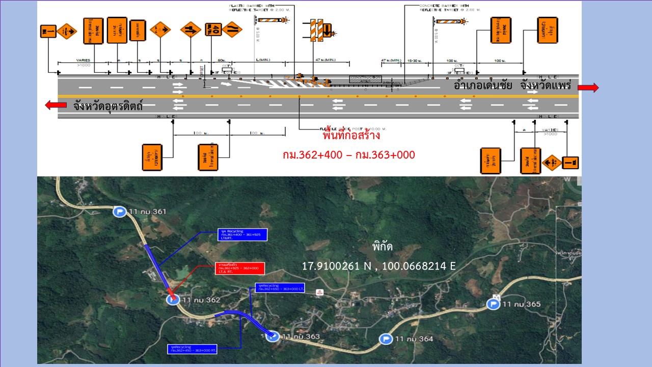 ประชาสัมพันธ์เบี่ยงการจราจร ตั้งแต่วันที่ 7 มีนาคม 2568 จนกว่าการก่อสร้างจะแล้วเสร็จ ทางหลวงหมายเลข 11 ตอน หนองน้ำเขียว - ปางเคาะ (ช่วงอุตรดิตถ์ - เด่นชัย) ระหว่างกม.352+200 - กม.369+600 (เป็นช่วงๆ)