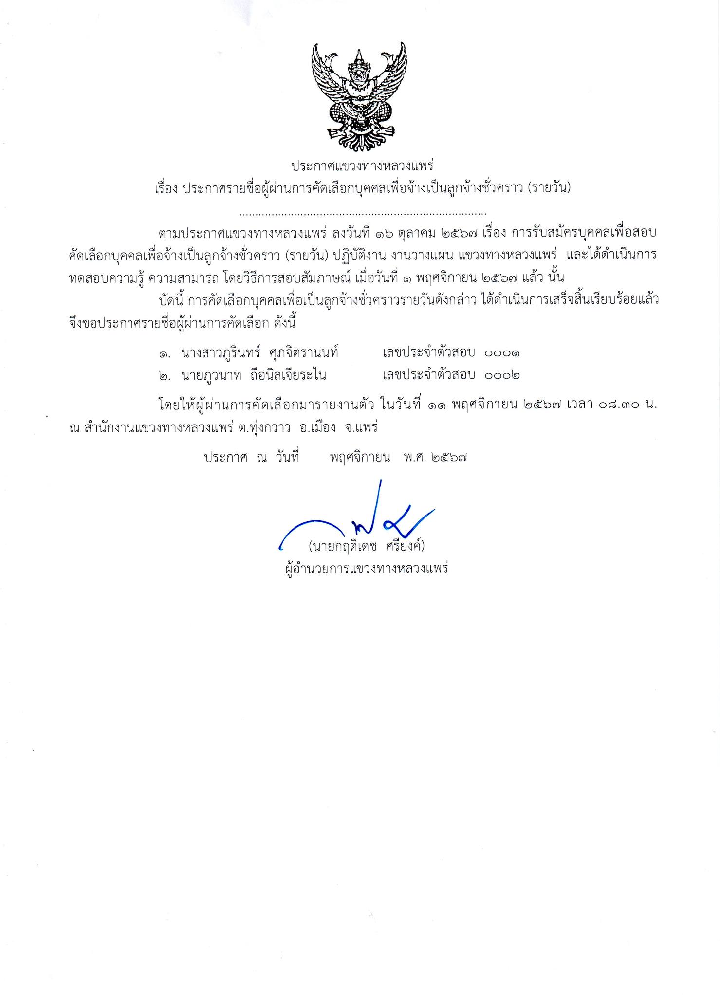 ประกาศรายชื่อผู้ผ่านการคัดเลือกบุคคลเพื่อจ้างเป็นลูกจ้างชั่วคราว(รายวัน) ปฎิบัติงาน งานวางแผน แขวงทางหลวงแพร่