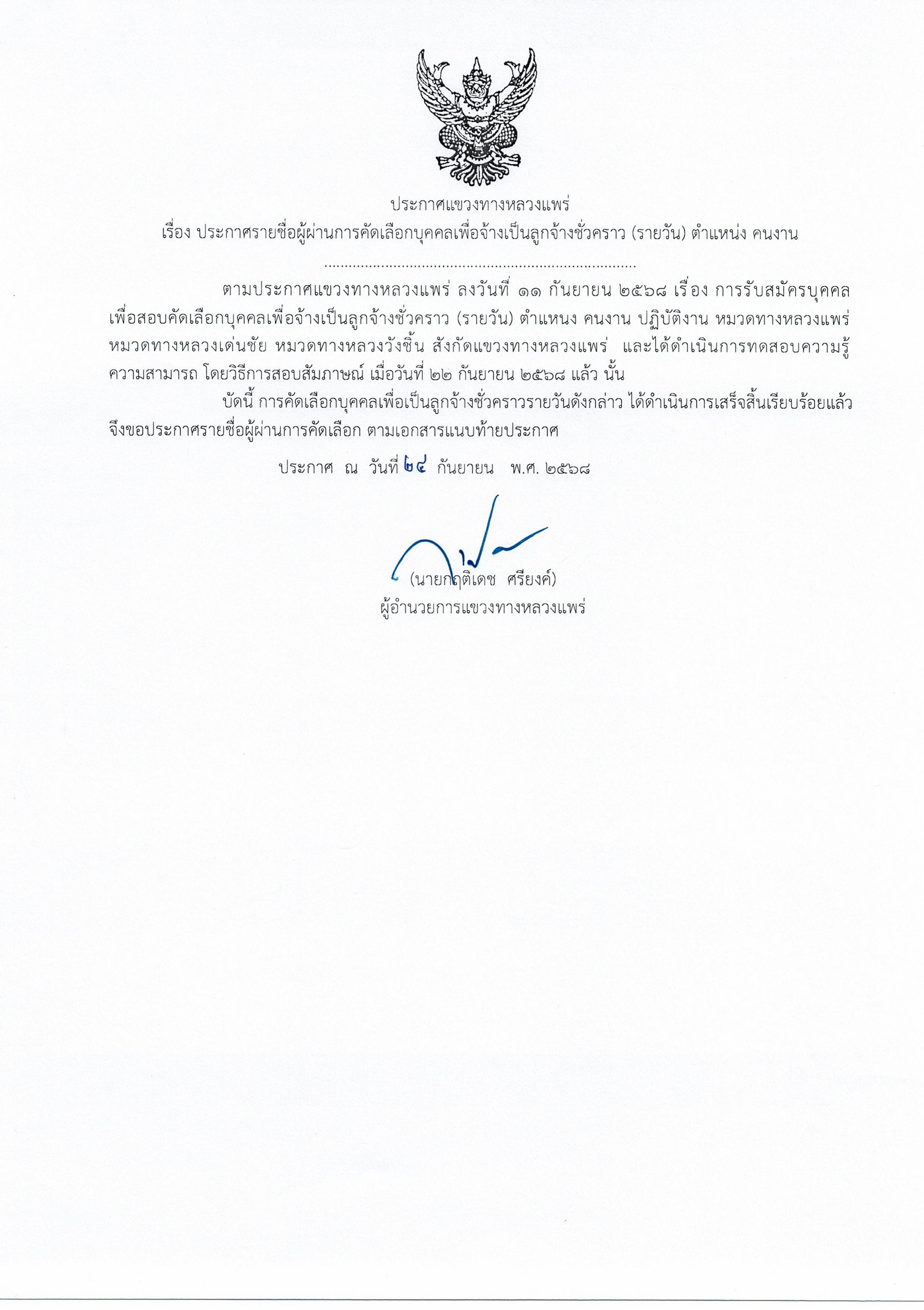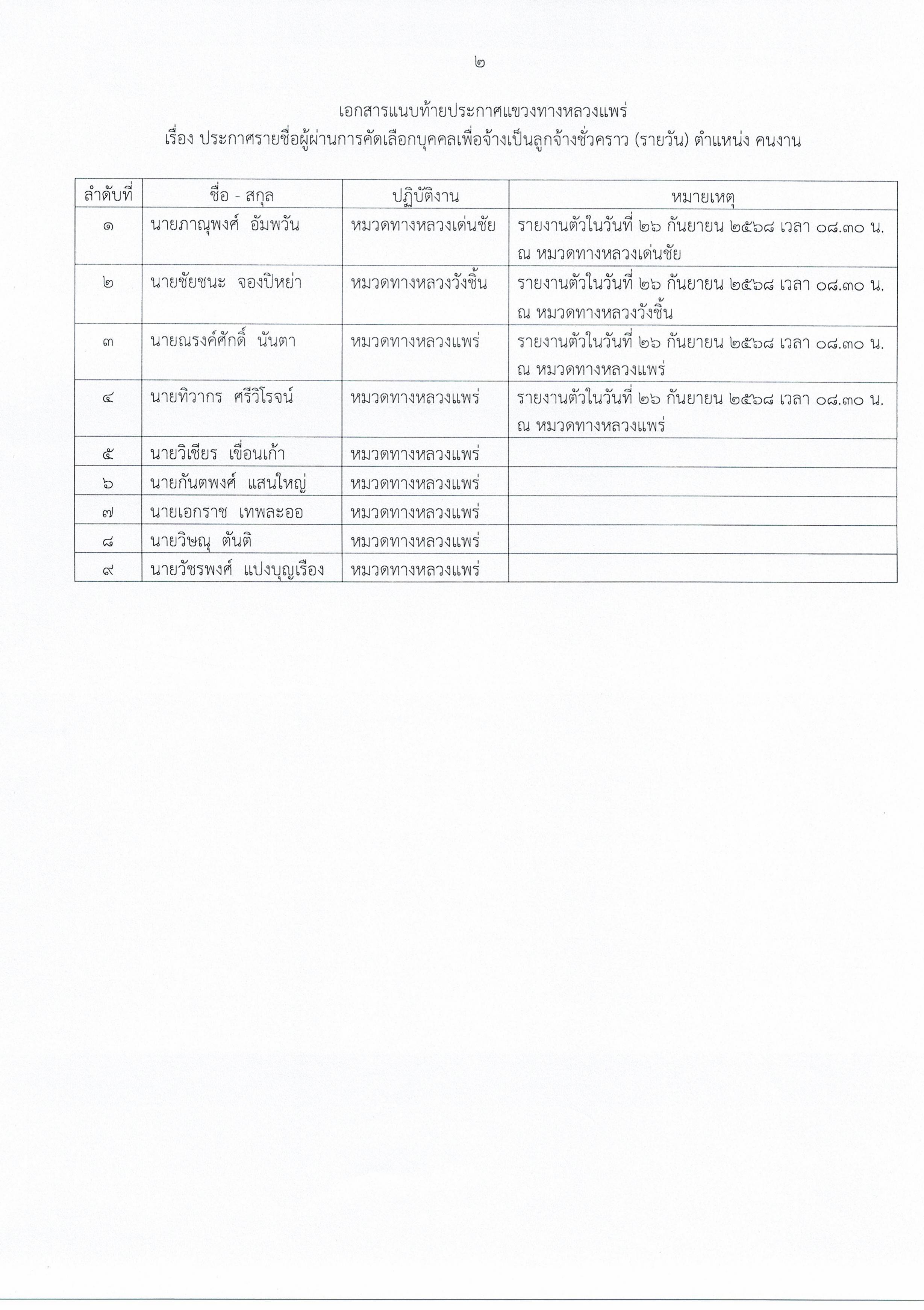ขอให้ผู้ผ่านการคัดเลือกลำดับที่ 1 - 4 เข้ารายงานตัวในวันที่ 26 กันยายน 2568 ณ หมวดทางหลวงที่ท่านได้ลงสมัครไว้ ตามรายละเอียดดังแนบ