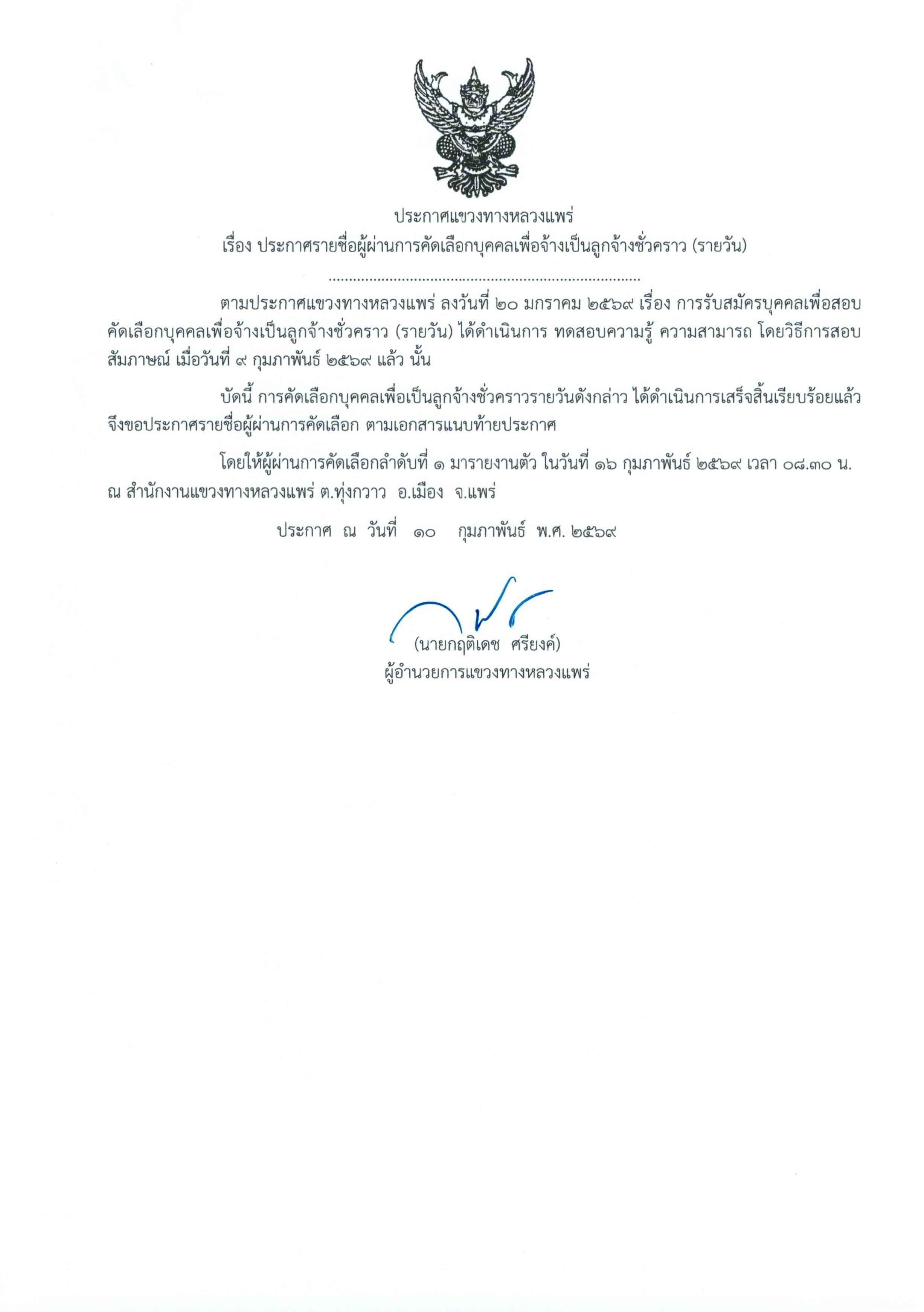 โดยให้ผู้ผ่านการคัดเลือกลำดัยที่ มารายงานตัว ในวันที่ 16 กุมภาพันธ์ 2569 เวลา 08.30 น. ณ สำนักงานแขวงทางหลวงแพร่ ต.ทุ่งกวาว อ.เมือง จ.แพร่