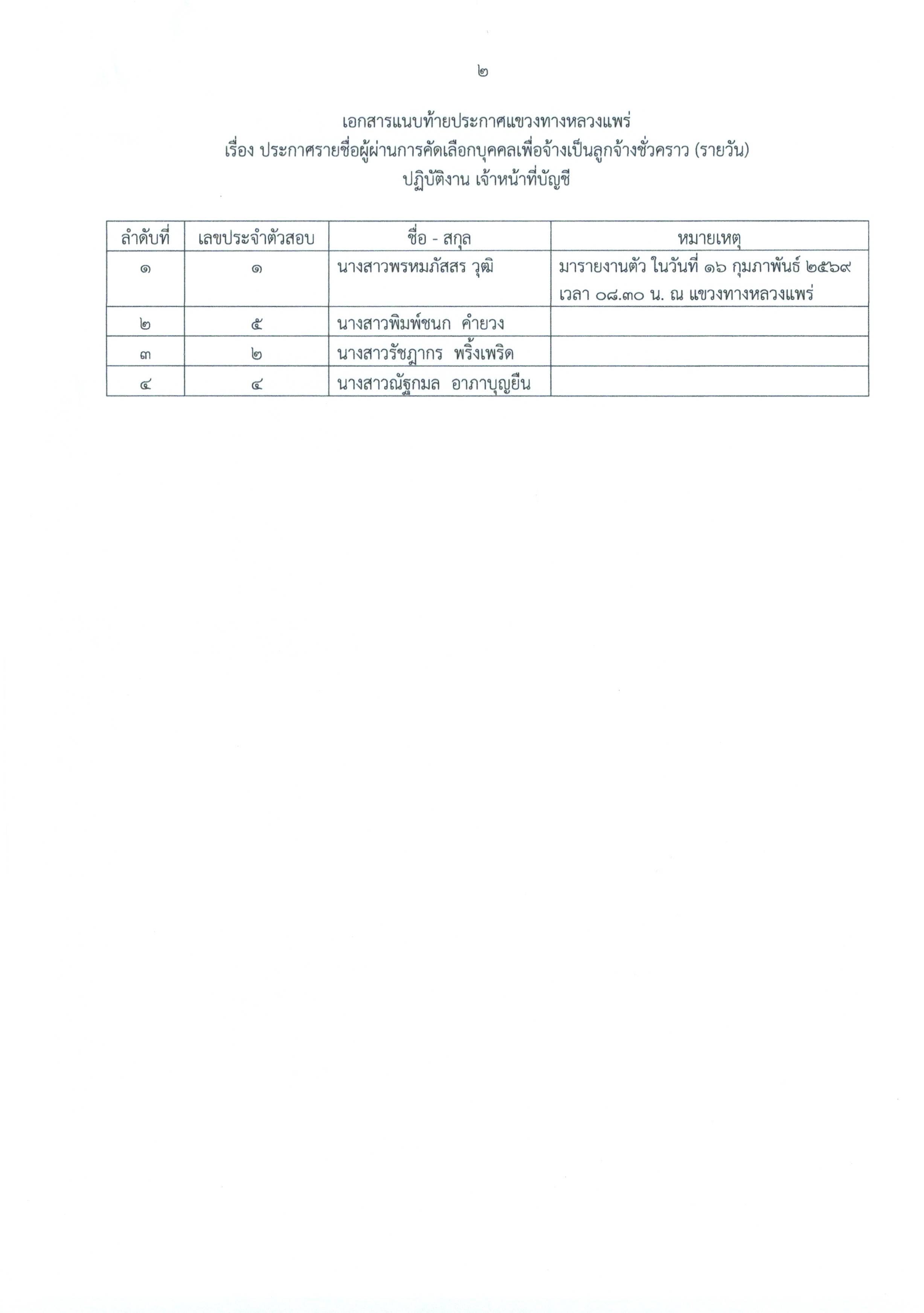 ประกาศรายชื่อผู้ผ่านการคัดเลือกบุคคลเพื่อจ้างเป็นลูกจ้างชั่วคราว(รายวัน) ปฎิบัติงาน เจ้าหน้าที่บัญชี