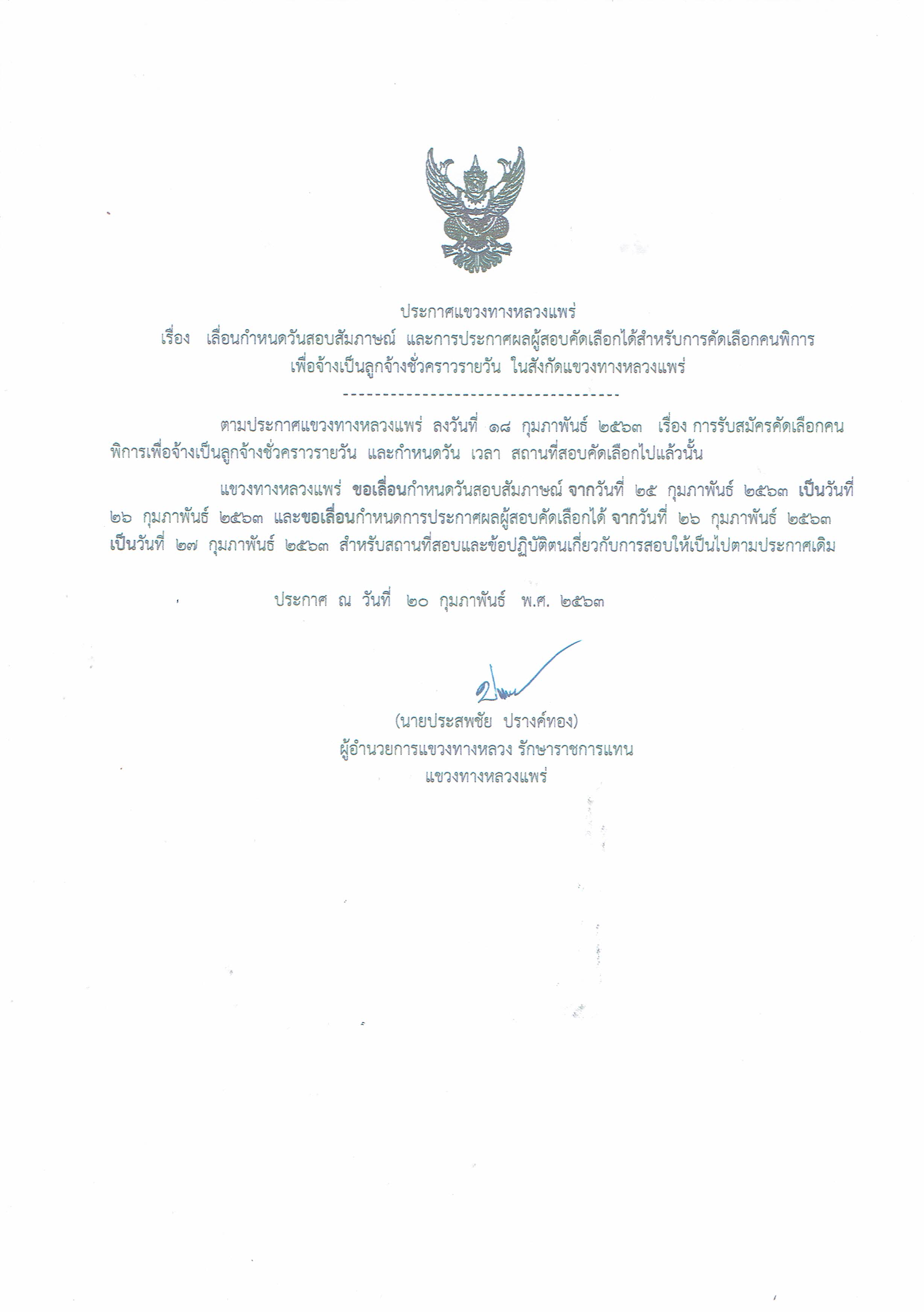 แขวงทางหลวงแพร่ แจ้งเลื่อนกำหนดวันสอบสัมภาษณ์และการประกาศผลผู้สอบคัดเลือกได้ สำหรับการคัดเลือกคนพิการเพื่อจ้างเป็นลูกจ้างชั่วคราวรายวัน