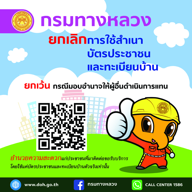กรมทางหลวง อำนวยความสะดวกให้แก่ประชาชนที่มาติดต่อขอรับบริการจากหน่วยงานของกรมทางหลวง ใช้แค่บัตรประชาชนและทะเบียนบ้านตัวจริง