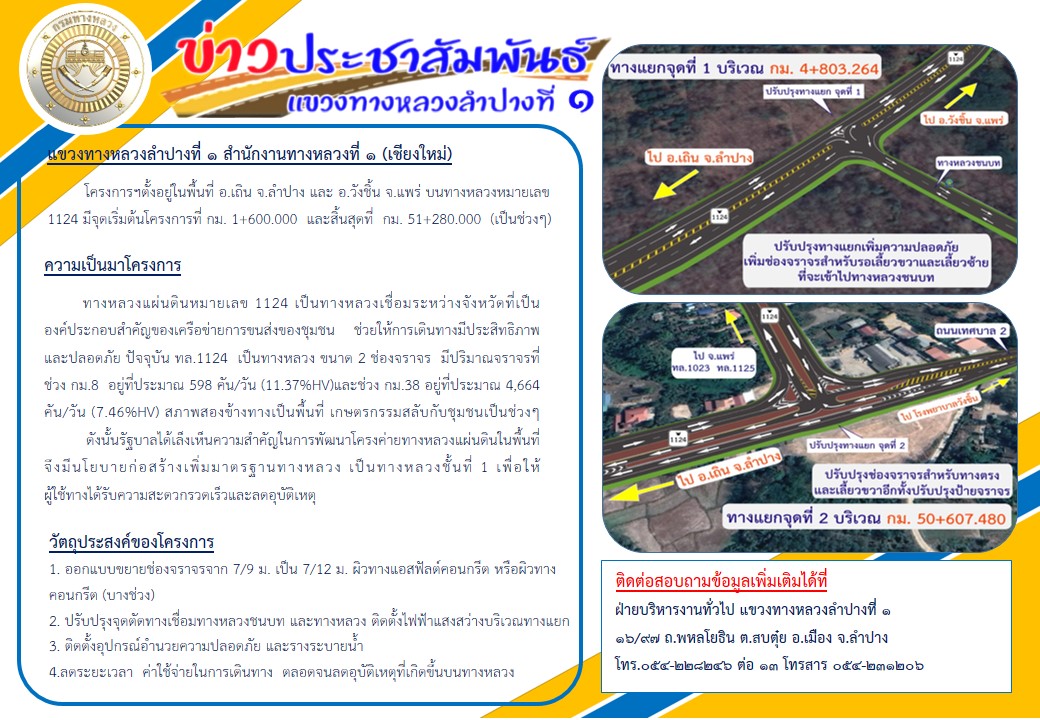 ประชาสัมพันธ์ โครงการก่อสร้างทางหลวงหมายเลข 1124 สาย อ.เถิน – อ.วังชิ้น ตอน บ.ปางกุ่ม – อ.วังชิ้น ระหว่าง กม.1+600.000 – กม.9+100.000, กม.11+450.000 – กม.27+500.000, กม.29+000.000 – กม.30+000.000 และกม.49+500.000 - กม.51+280.000 ระยะทางยาวประมาณ 26.330 กิโลเมตร เริ่มต้นสัญญาวันที่ 20 มิถุนายน 2566 สิ้นสุดสัญญาวันที่ 8 มิถุนายน 2568 ระยะเวลาทำการ 720 วัน โดยมีบริษัท กรีนไลท์ อินเตอร์เนชั่นแนล จำกัด เป็นผู้รับจ้าง