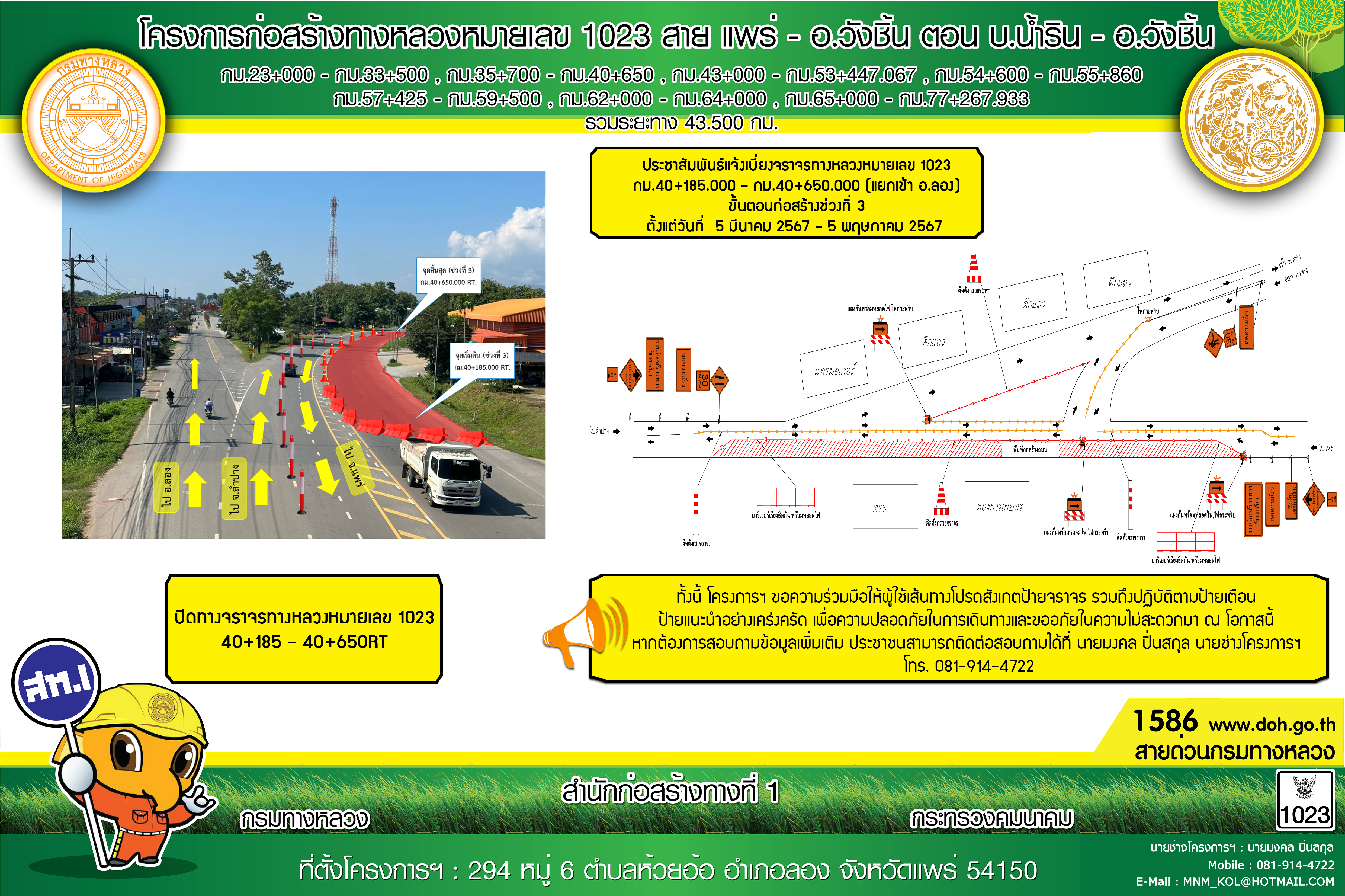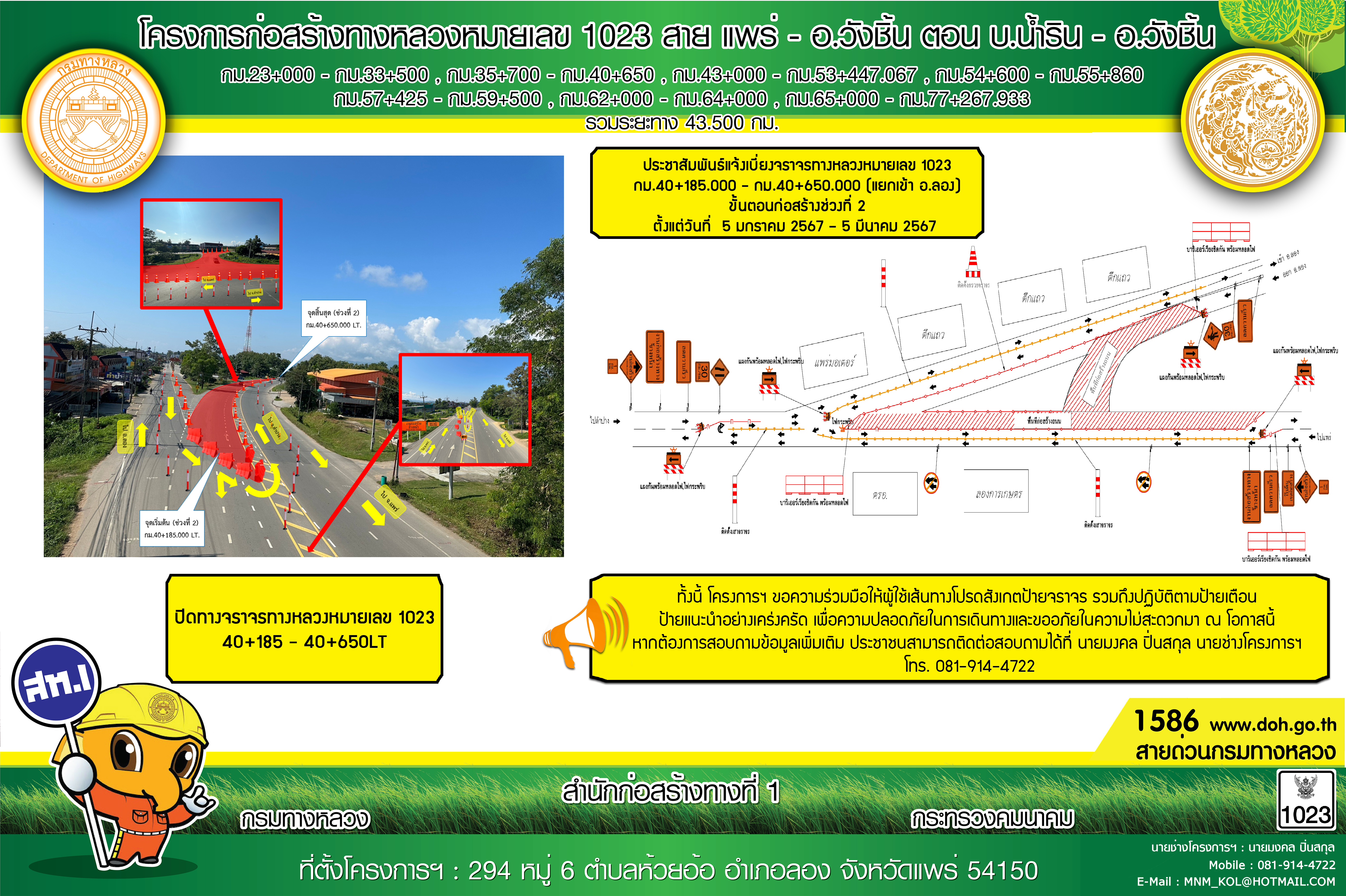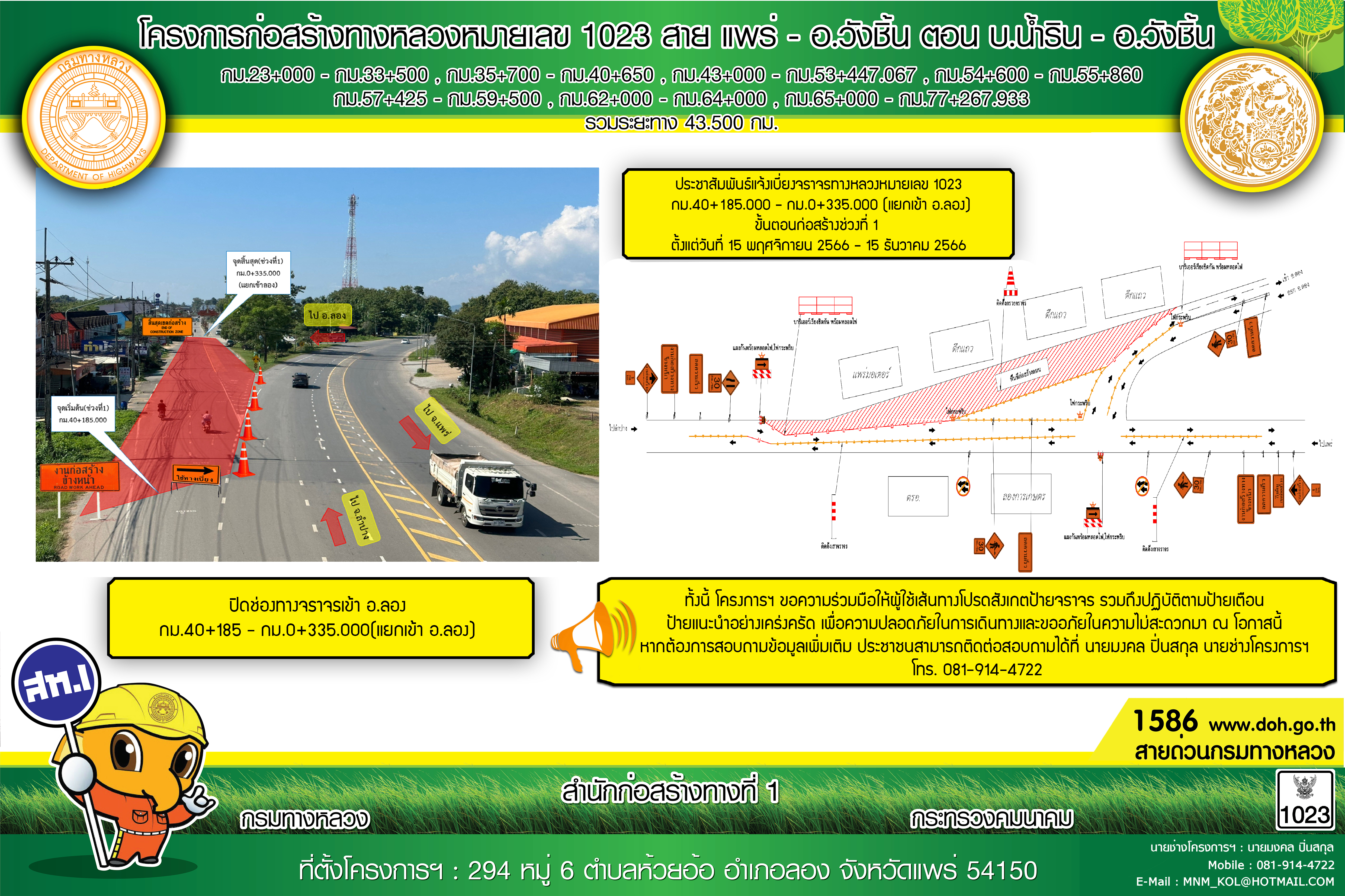 ประกาศ 15 พ.ย. 66 เป็นต้นไป ประชาสัมพันธ์แจ้งเบี่ยงจราจรทางหลวงหมายเลข 1023 กม.40+185.000 - กม.40+650.000 (แยกเข้า อ.ลอง จ.แพร่)