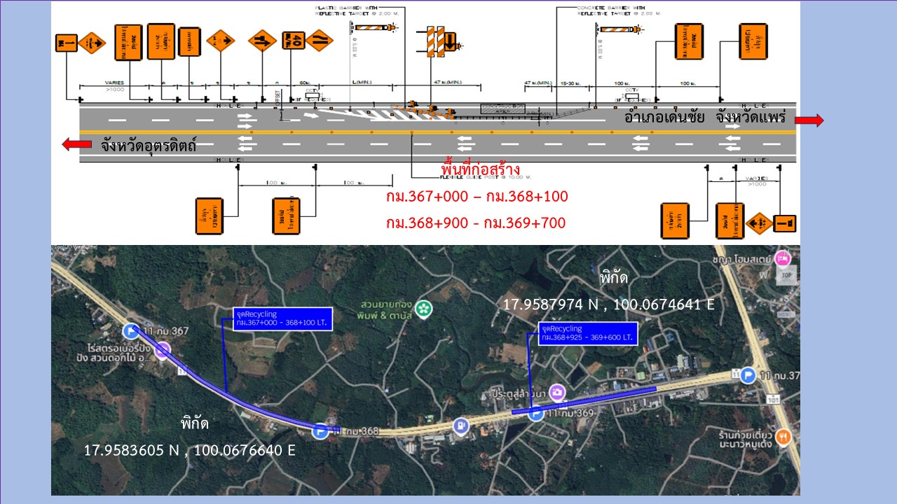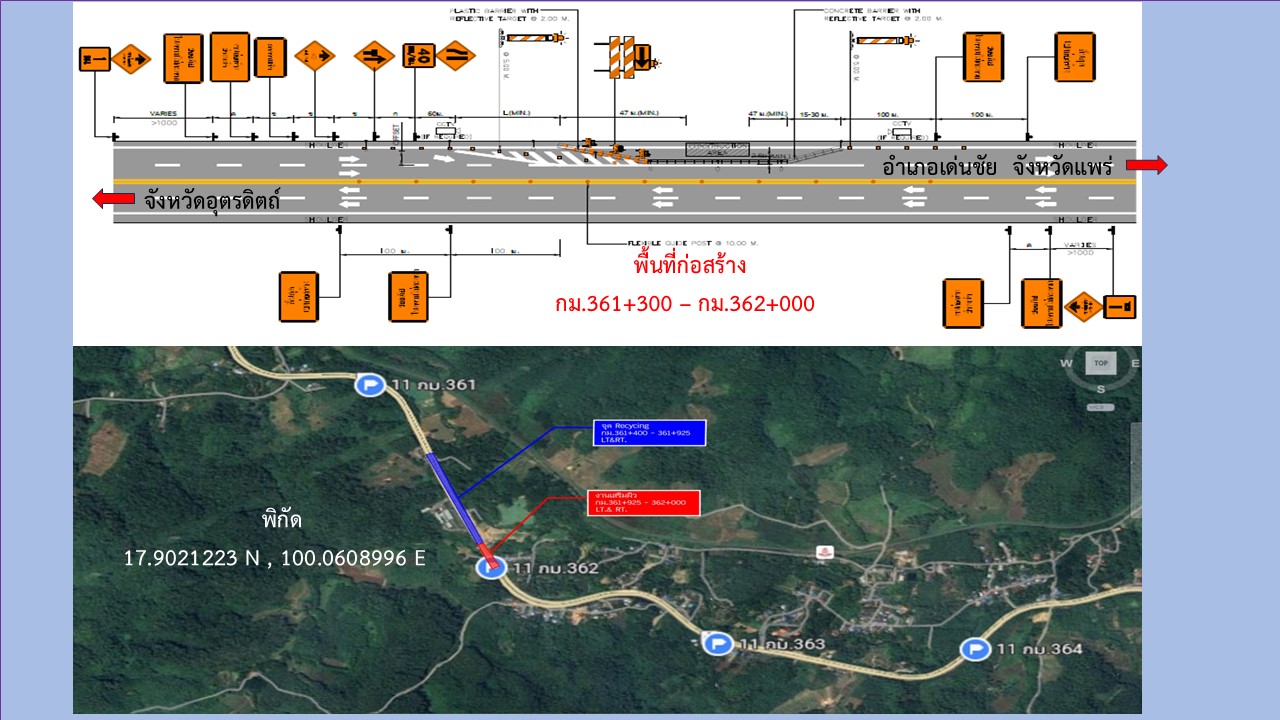 ประชาสัมพันธ์เบี่ยงการจราจร ตั้งแต่วันที่ 7 มีนาคม 2568 จนกว่าการก่อสร้างจะแล้วเสร็จ ทางหลวงหมายเลข 11 ตอน หนองน้ำเขียว - ปางเคาะ (ช่วงอุตรดิตถ์ - เด่นชัย) ระหว่างกม.352+200 - กม.369+600 (เป็นช่วงๆ)